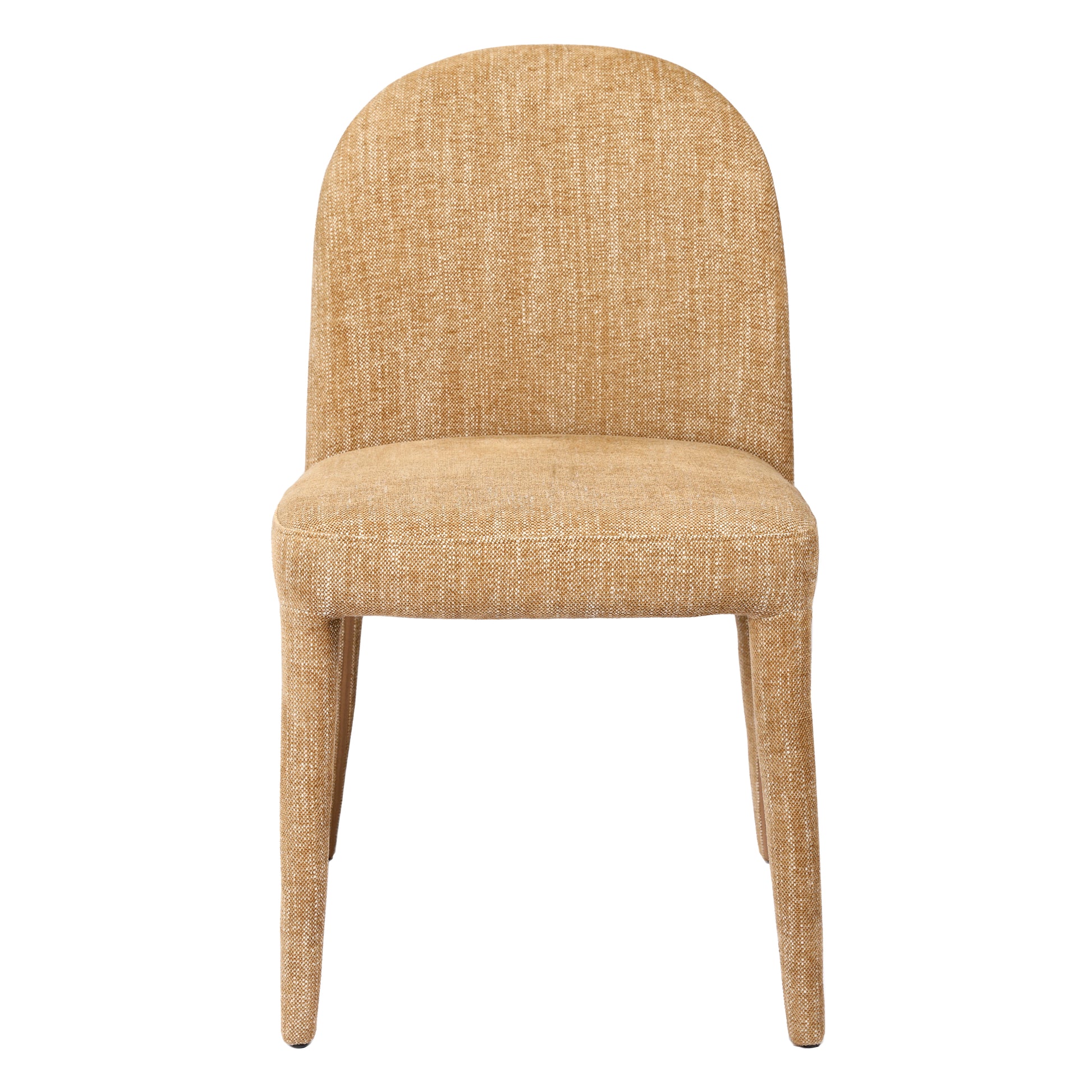 Clean lines meet natural texture in the Eska Dining Chair. With its softly rounded backrest and generously padded seat, this fully upholstered piece offers comfort without compromise on style. The wheat beige woven fabric adds warmth and versatility, making it an effortless match for both neutral and bolder schemes. A slim concealed steel frame gives strength and structure while maintaining a seamless finish. Eska is ideal for dining spaces, desks or refined seating moments throughout the home. Additional brown colourway available. 51x59x83cm. Also available with arms as the Eska Carver Upholstered Dining Chair in Wheat Beige, offering the same comfort with added support. 56x60x83cm.