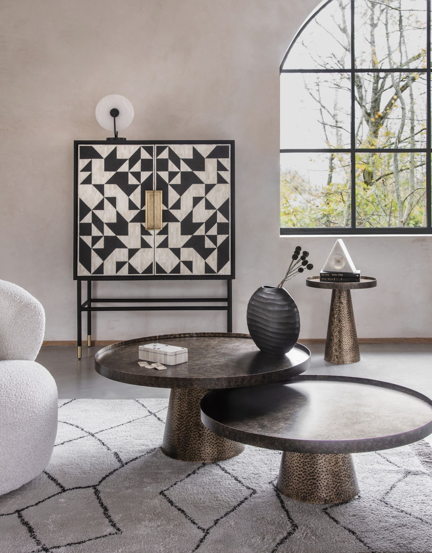 Make celebrations classic with this beautiful bone inlay drinks cabinet that boasts an eye-catching monochrome geometric design in ivory and black.